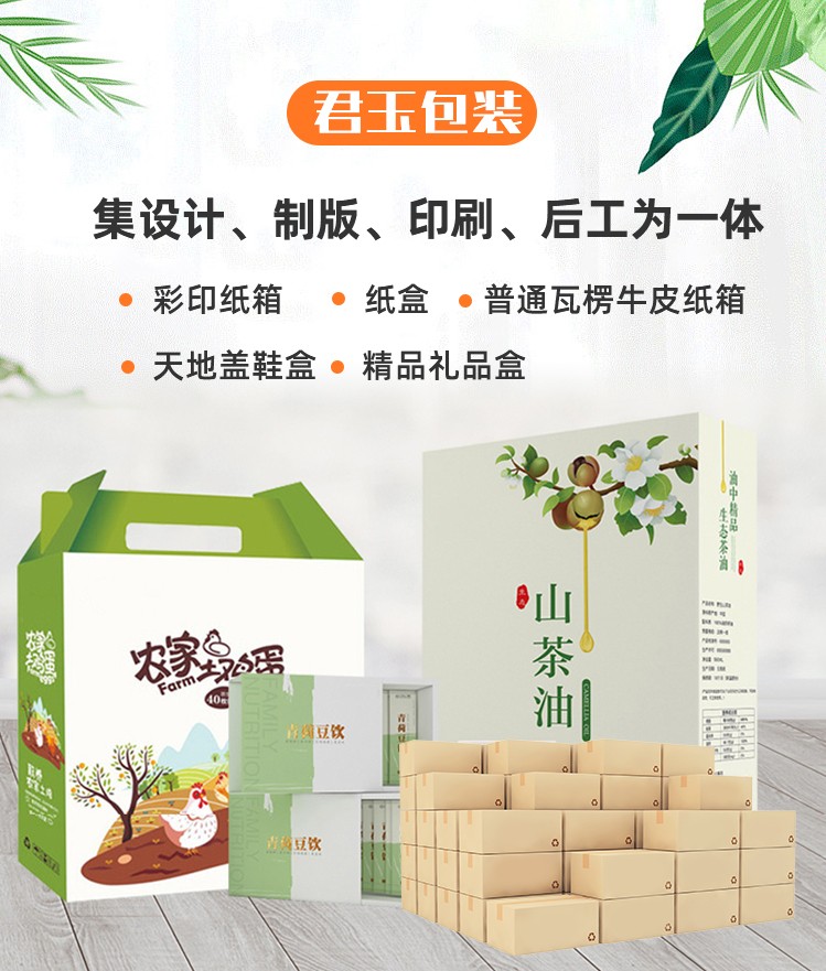 武陟縣君玉包裝有限公司是一家集設計、制版、印刷、后工為一體的紙制品生產(chǎn)企業(yè),產(chǎn)品主要分類:彩印紙箱、紙盒、普通瓦楞牛皮紙箱、天地蓋鞋盒、精品禮品盒等紙制品包裝。